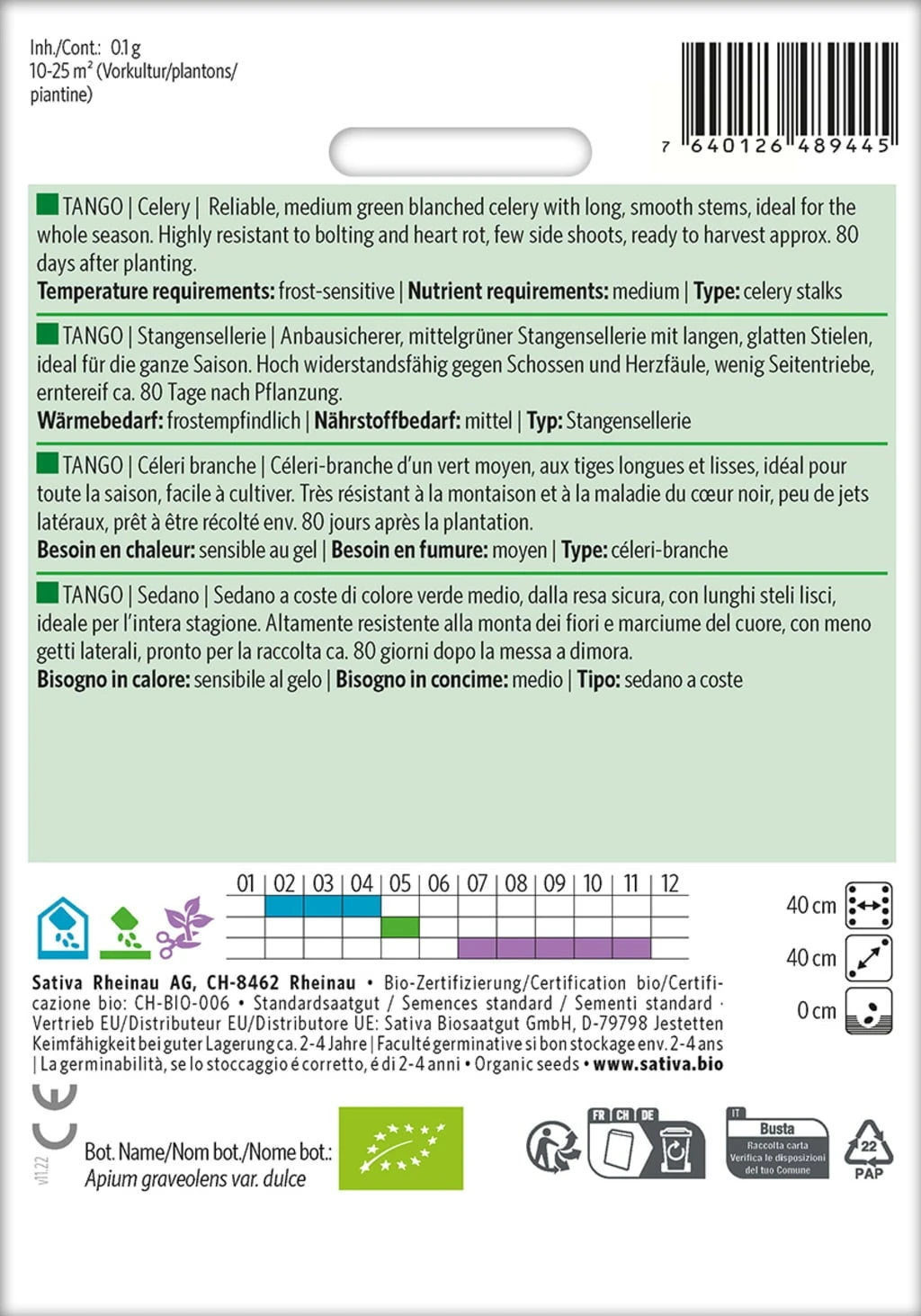 Il sedano “Tango” è la varietà ideale per tutta la stagione, poiché ha steli lunghi e lisci con pochi germogli laterali. La varietà è anche estremamente resistente alla monta a seme e al marciume del cuore. La raccolta è possibile circa 80 giorni dopo la semina.
