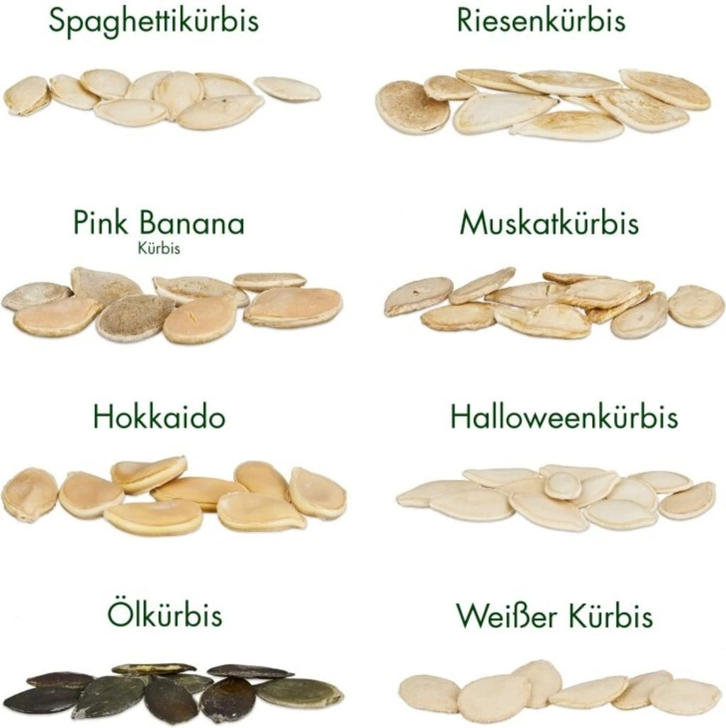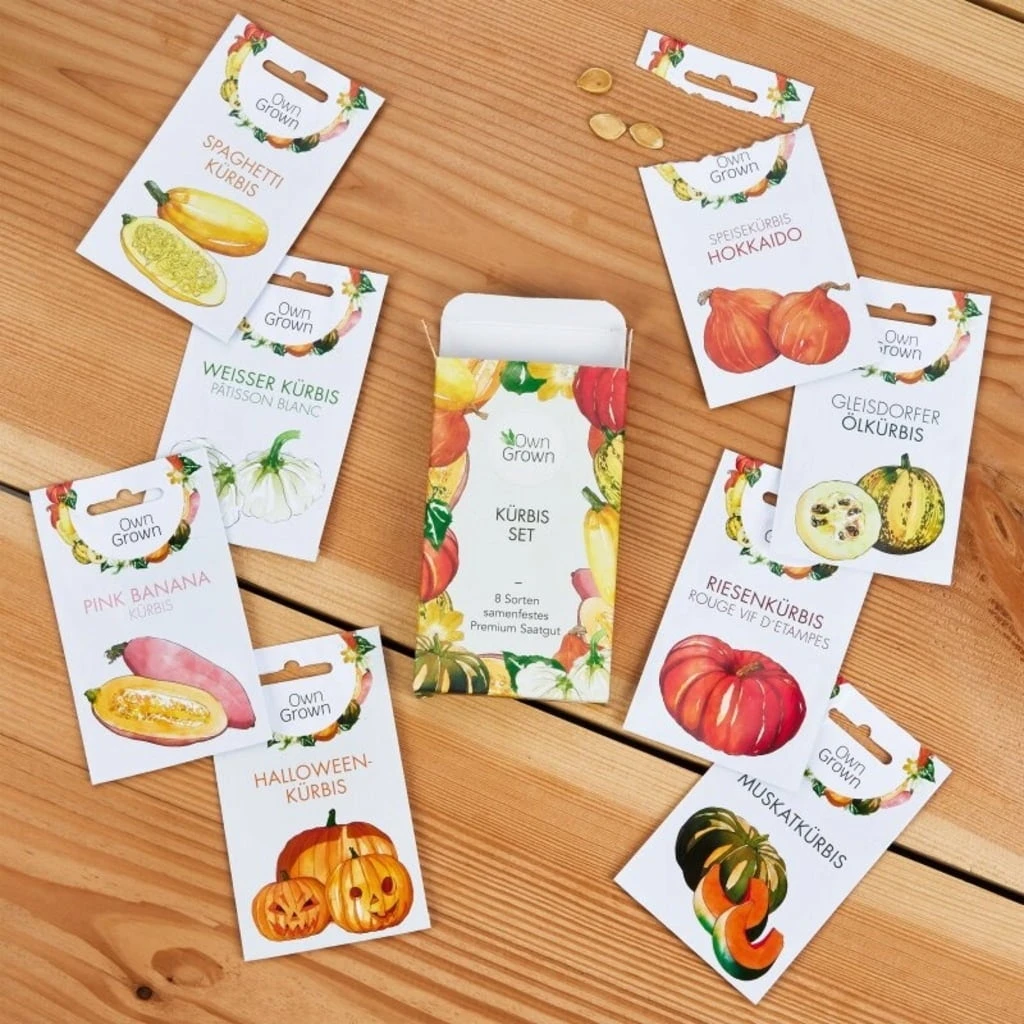 Questo set contiene otto diversi tipi di zucca, tutti adatti al consumo e perfetti per decorare. A seconda della varietà, le zucche possono essere coltivate in un orto rialzato, in una serra, in un giardino o in un compost.